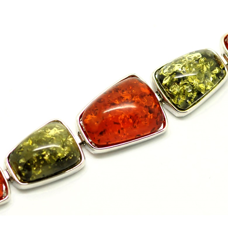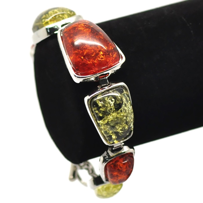 Silver tone metal bracelet made with seven high-quality, faux Amber stones.