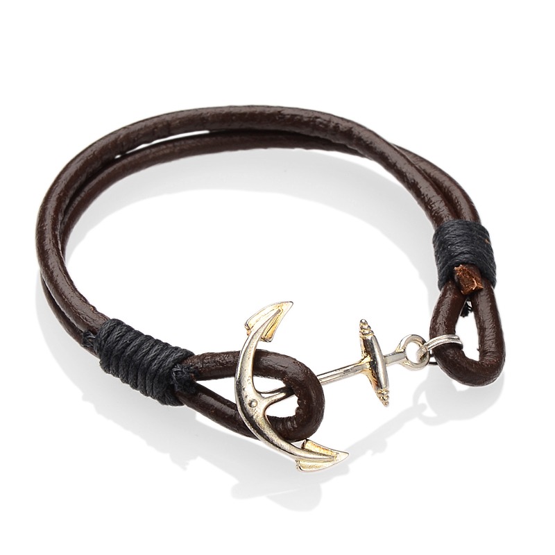 Two-strand, solid brown leather bracelet featuring a silver tone metal ship anchor. A cute and fun accessory!