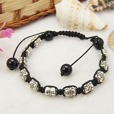 Shamballa bracelets with ten Tibetan silver beads in the form of beaded barrels with four black glass accent beads.