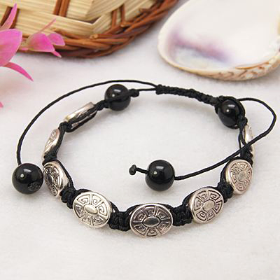 Shamballa bracelets with Tibetan silver oval beads with a relief geometric floral design and four black glass accent beads. Dimensions: 3" to 4" diameter.