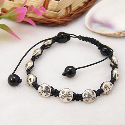 Shamballa bracelets with Tibetan silver round beads with embedded flower blossoms and four black glass accent beads.
