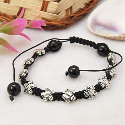 Shamballa bracelets with Tibetan silver beads with a striped flower blossom design and four black glass accent beads.