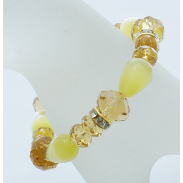 Stretch bracelet made of Cat's Eye beads with faceted AB glass beads and genuine rhinestone-studded gold tone spacers. Dimensions: 2 1/3" inner diameter that stretches.
