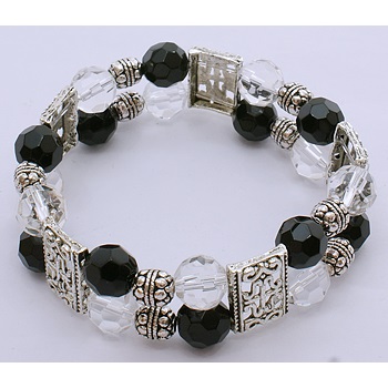 Elegant stretch bracelet made of alternating black and white, faceted crystal beads with reticulated filigree Tibetan silver spacers.