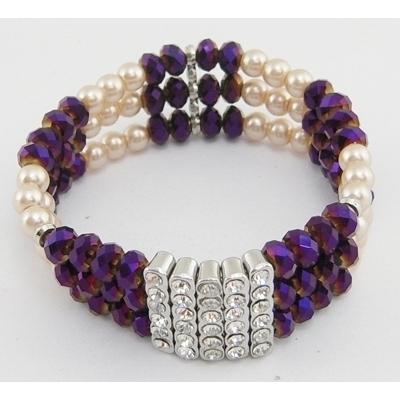 Stretch bracelet made of 60 iridescent, amethyst Aurora Borealis faceted crystal beads with 36 faux pearl beads and a beautiful, silver-tone center with 30 rhinestone accents.