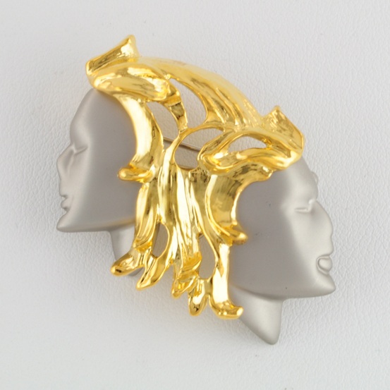 Figural brooch depicting the zodiac sign of Gemini. Two-tone construction of gold and pewter.