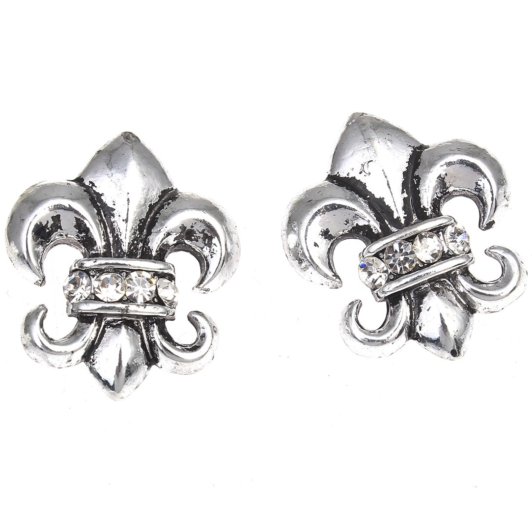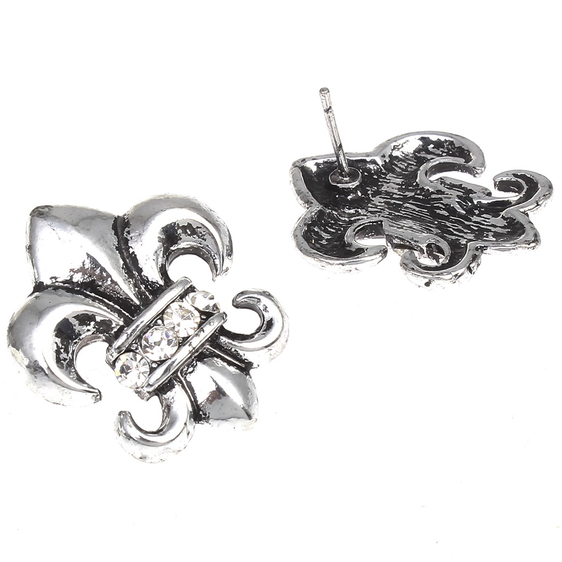 Antiqued, silver tone zinc earrings in an elegant, old world Fleur-de-Lis design with rhinestone-studded band at center.
