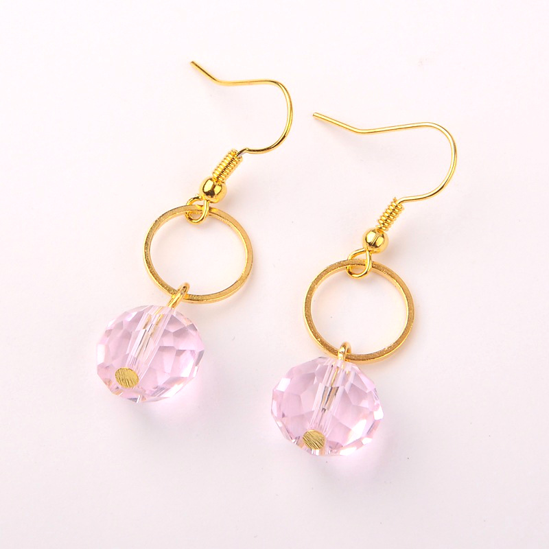 Bright brass dangle earrings featuring a circle accent with faceted Pink Crystal drop. An elegant pair!