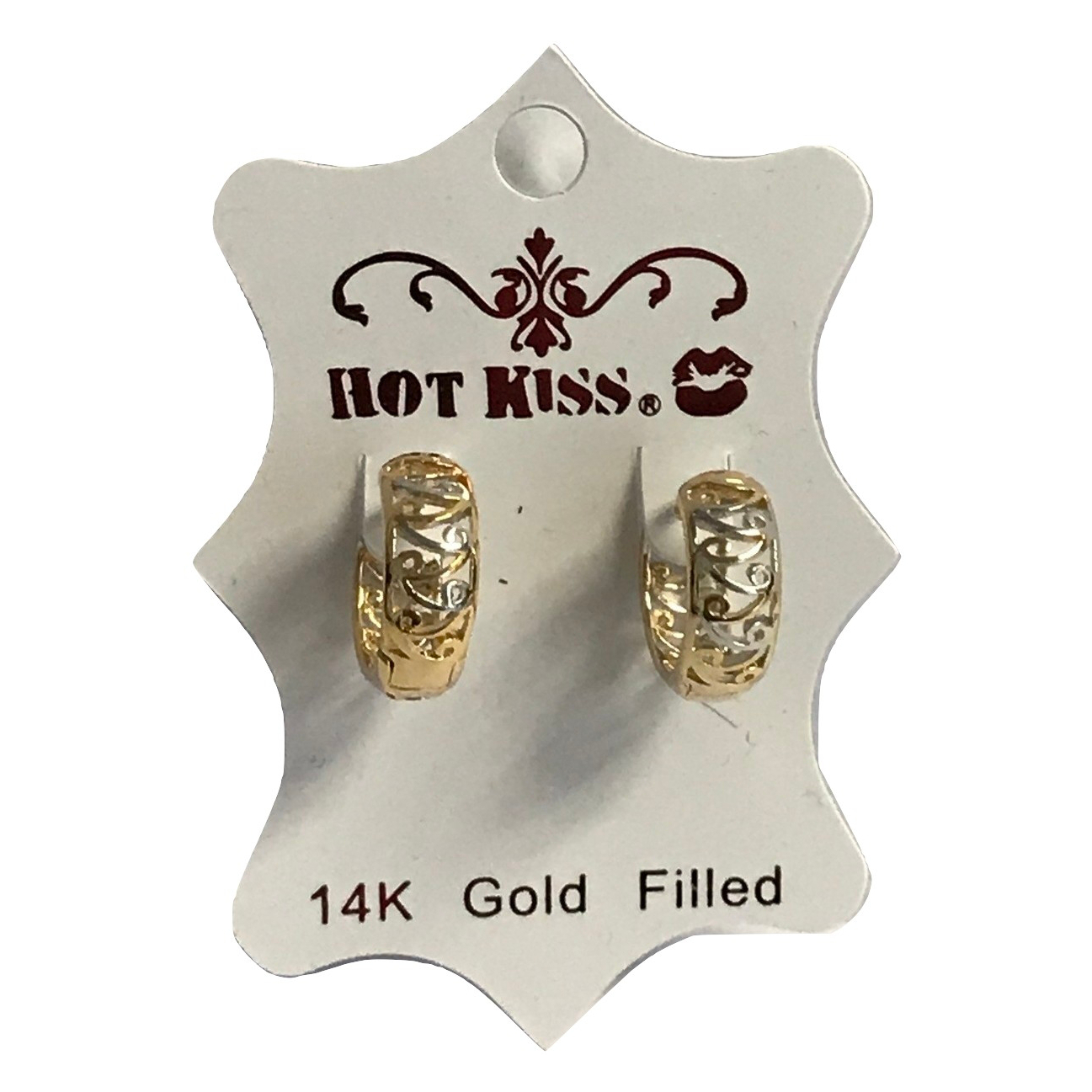 14K Gold Filled small hoop earrings by Hot Kiss featuring a reticulated filigree design of gold and sterling silver overlay.