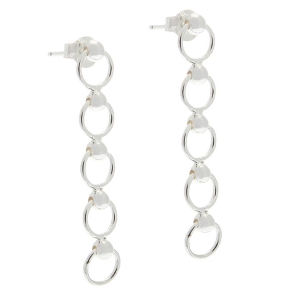 Sterling Silver dangle earrings featuring a chain of ball and circular loops. Post backs.