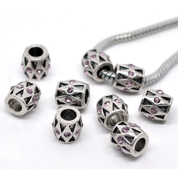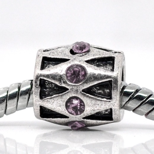 Tibetan Silver spacer bead in the form of a barrel with traingular pattern and genuine, inset purple Rhinestone accents.