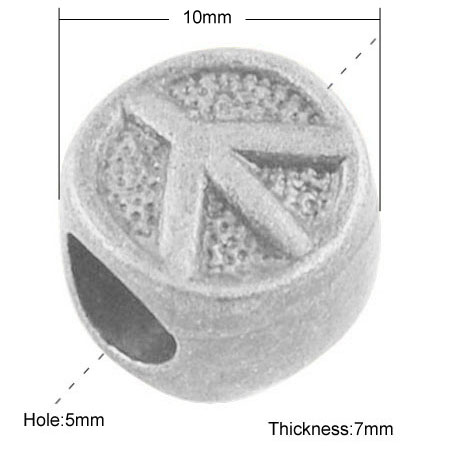 European bracelet beads made of solid Tibetan silver with high-relief depictions of the famous Peace sign with textured relief. Dimensions: 10mm wide with 5mm hole.