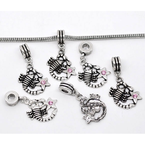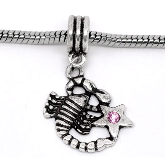 Tibetan Silver charm featuring a scorpion (zodiac Scorpio sign) with genuine, pink Rhinestone accent.