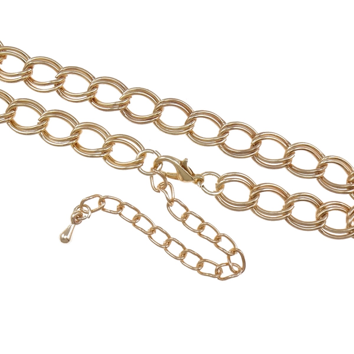 Modern, gold tone necklace in the Art Deco style featuring 34 faceted resin navettes on a thick, double-loop chain.