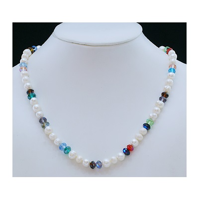 Hand-strung necklace of 42 genuine Freshwater Potato Pearls, size 8-9mm, and 26 geniune faceted crystal beads.