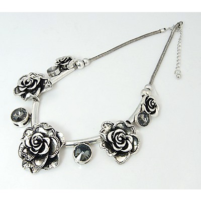 Heavy necklace made of snake chain with solid silver tone alloy flower blossoms and three large faceted Rhinestones with circular and tube metal beads.