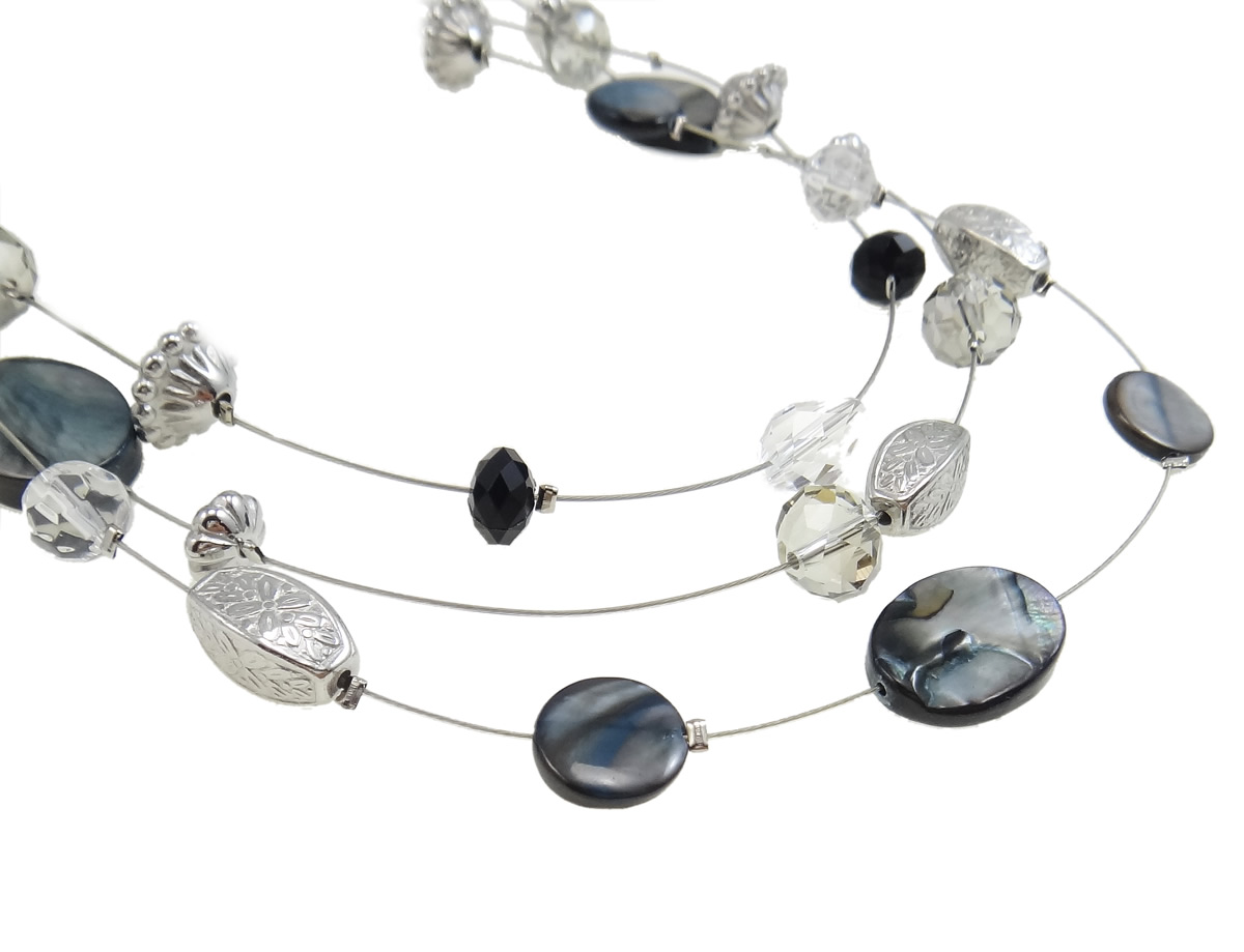 Three-strand, silver-tone necklace made with iridescent shell, faceted crystal and silver tone CCB beads.