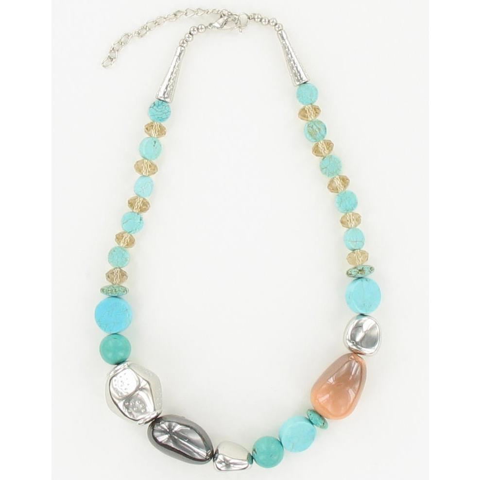Necklace made with turquoise, faceted glass and lustrous acrylic beads with a silver tone metal beads, lobster claw clasp and extension chain.