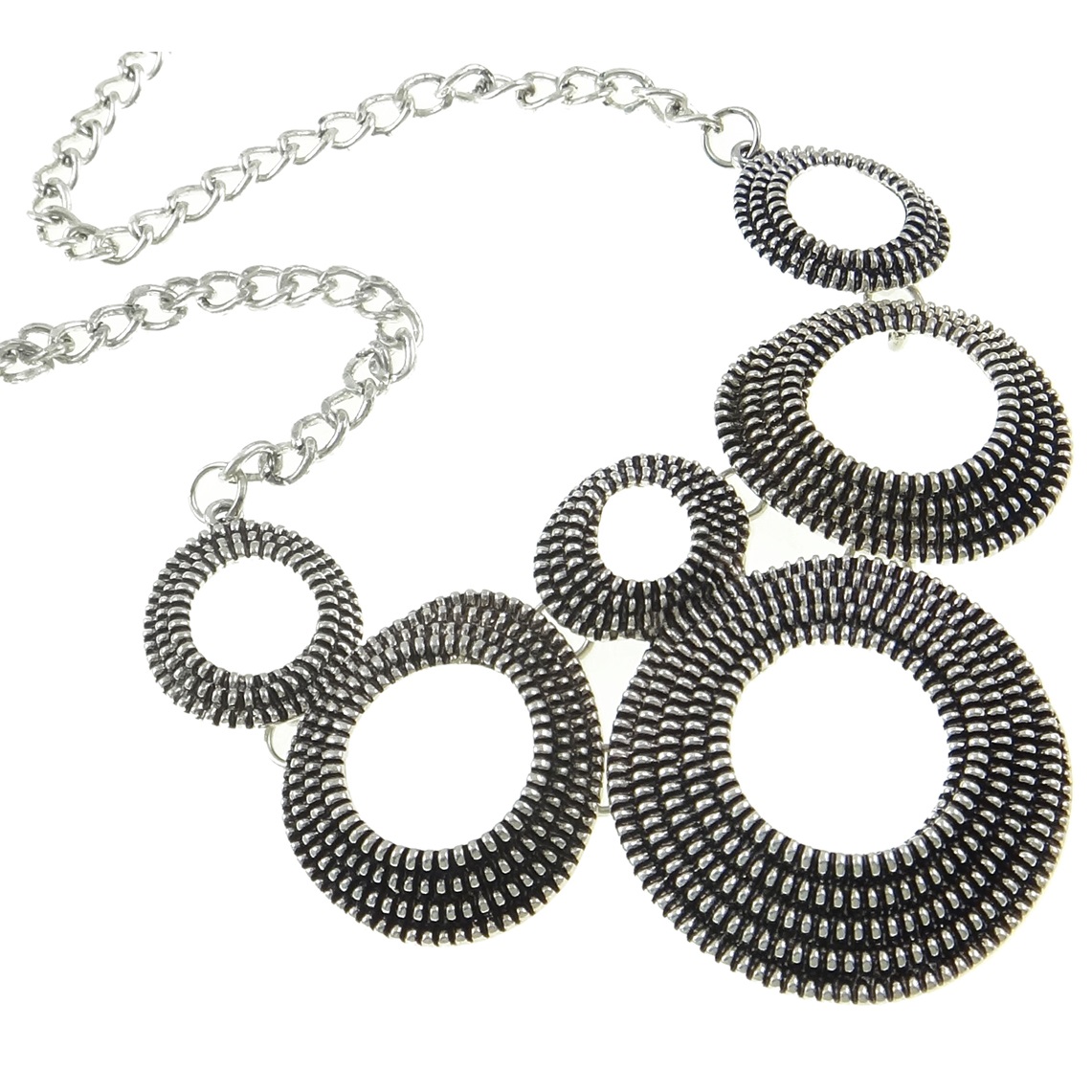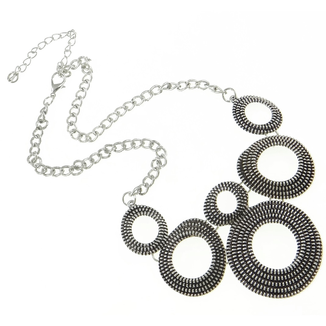 Retro 1960's Mod style statement necklace featuring six circles of various sizes made of concentric beading.
