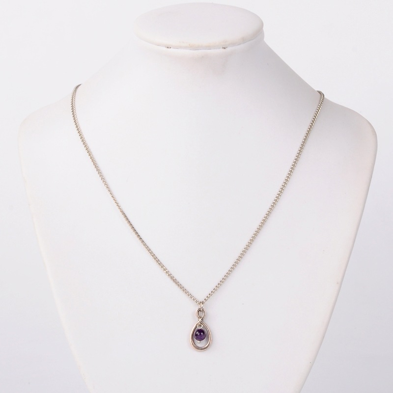 Simple, silver tone chain necklce featuring a tear-drop pendant with genuine Amethyst Gemstone bead at center.