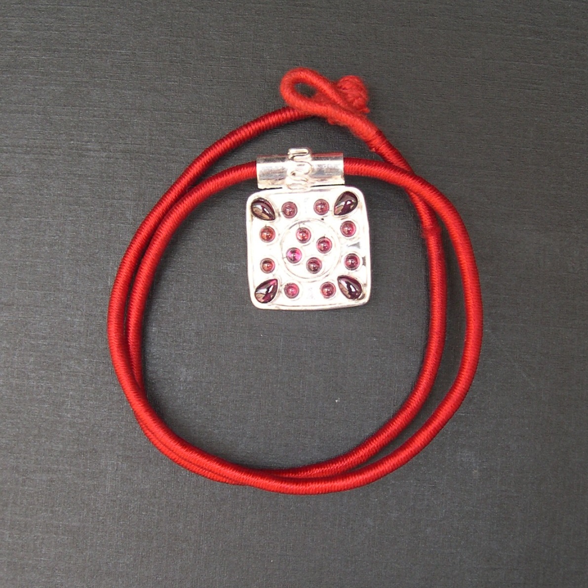 Red cord necklace featuring a solid Sterling Silver pendant with 16 genuine Amethyst cabochons.
