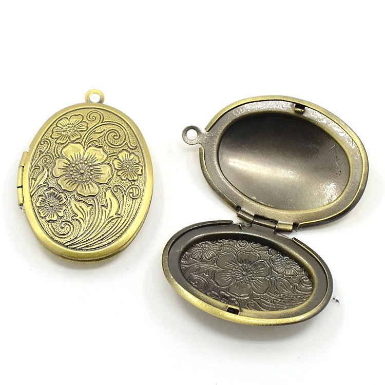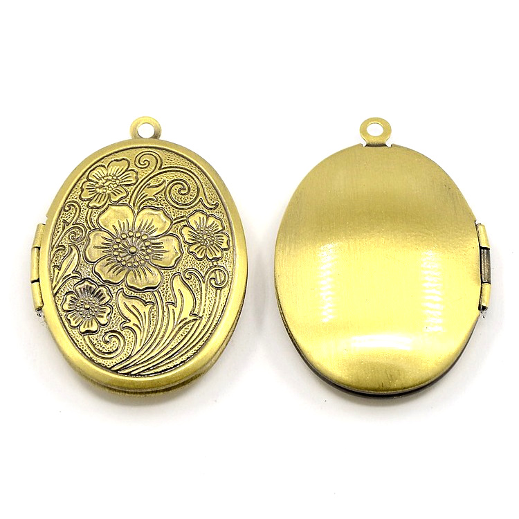 Brass tone metal oval locket pendant featuring a scene of inscribed flowers and foliage in a traditional Victorian style.