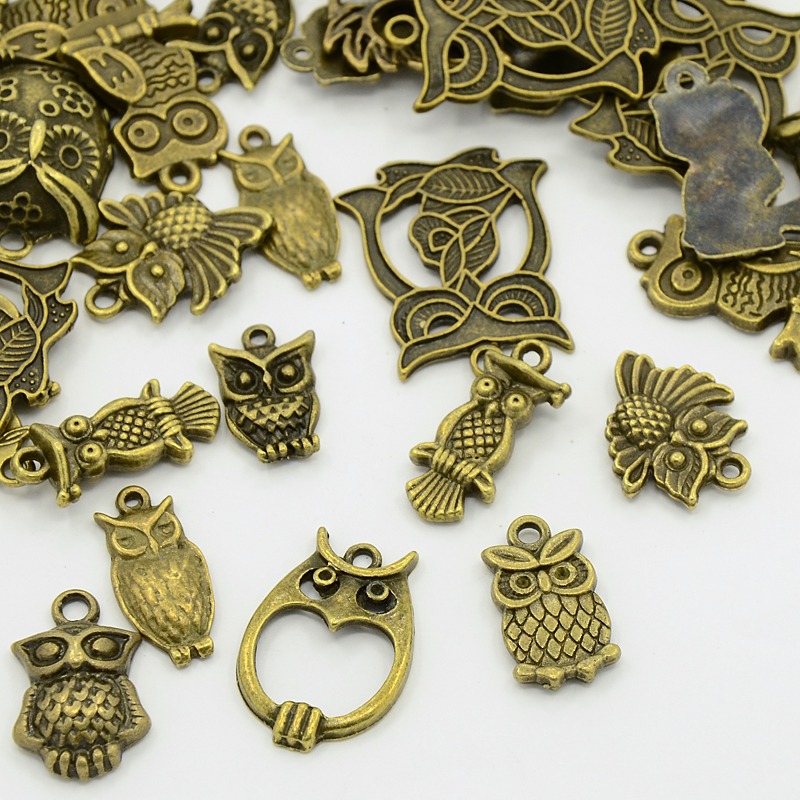 Mixed, bronze tone figural pendants all in various Owl Theme forms.