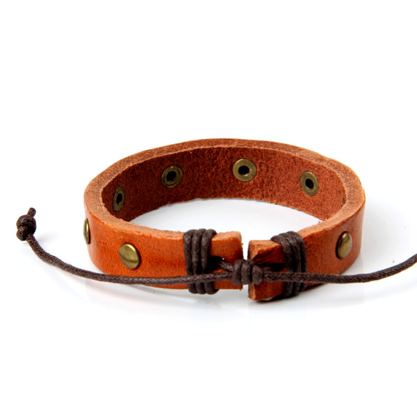 Genuine leather bracelet featuring gold studding and wax cord to adjust to most any wrist. A fun, modern accent!