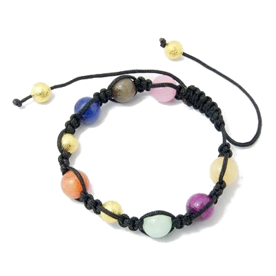 Adjustable shamballa bracelets made with seven mixed-color, solid glass beads and four sparkly gold beads.