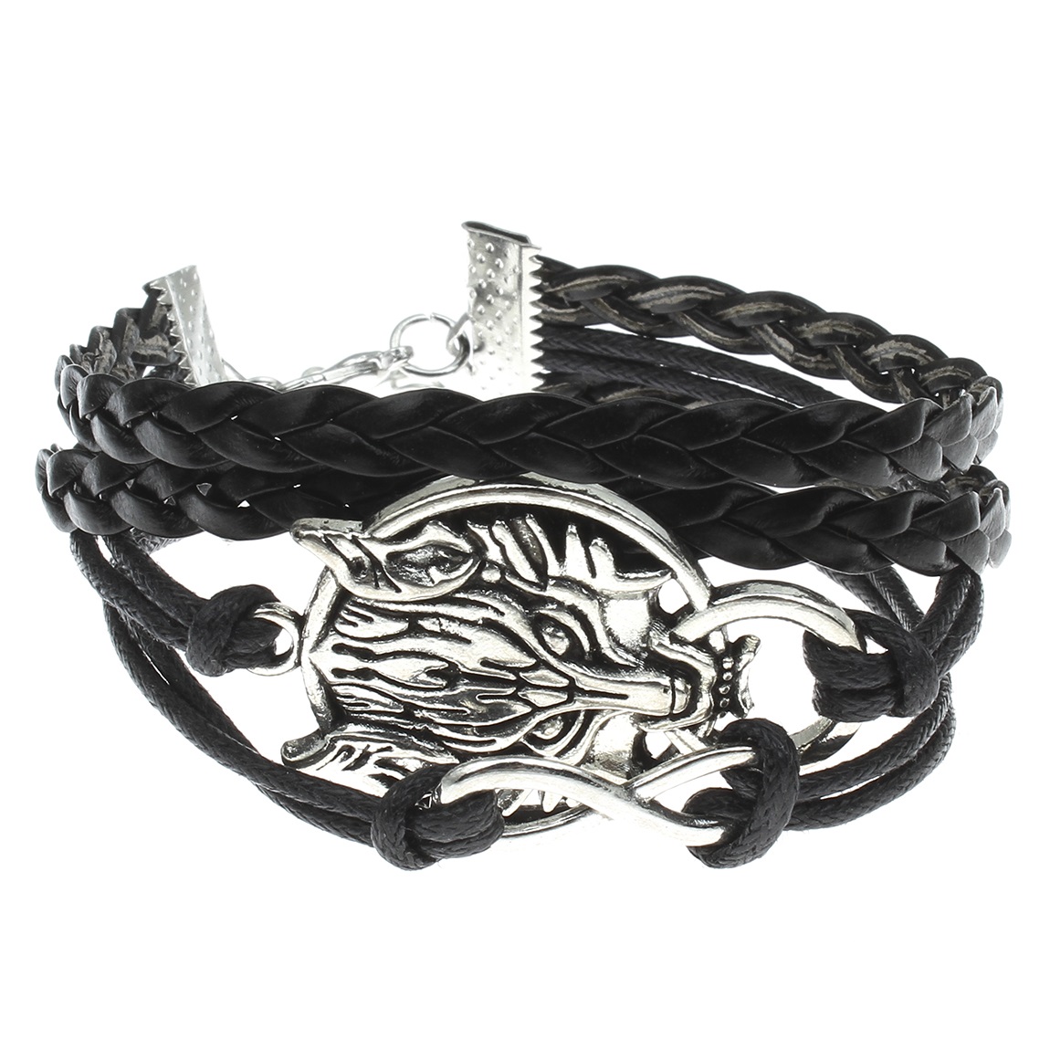 Black leather, multi-strand bracelet featuring a silver tone Wolf's Head and Infiinity Symbol.