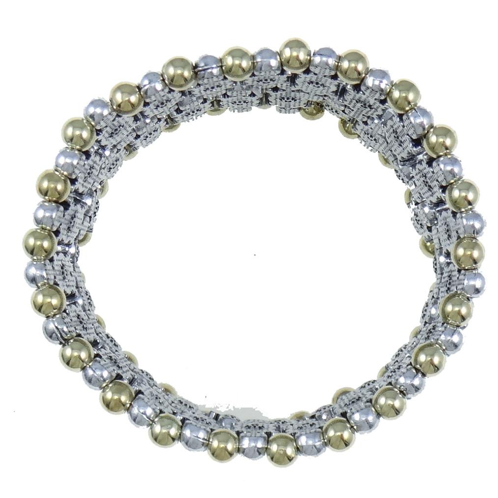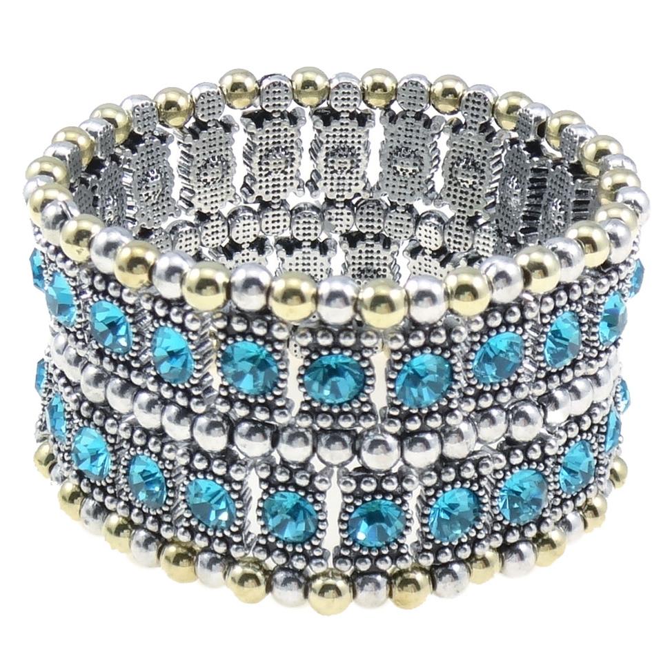 With 46 genuine, faceted Rhinestones, this stretch bracelet is hand-beaded with alternating silver and brass beads along the top and bottom.
