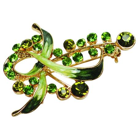 Brooch with green, genuine rhinestone flower blossoms and enamel-decorated foliage.