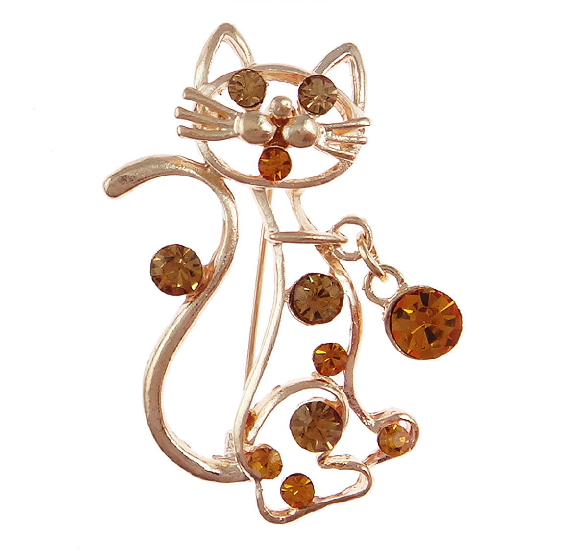 Gold tone brooch depicting figural cat holding a rhinestone charm. Dimensions: 1" x 1 3/4".