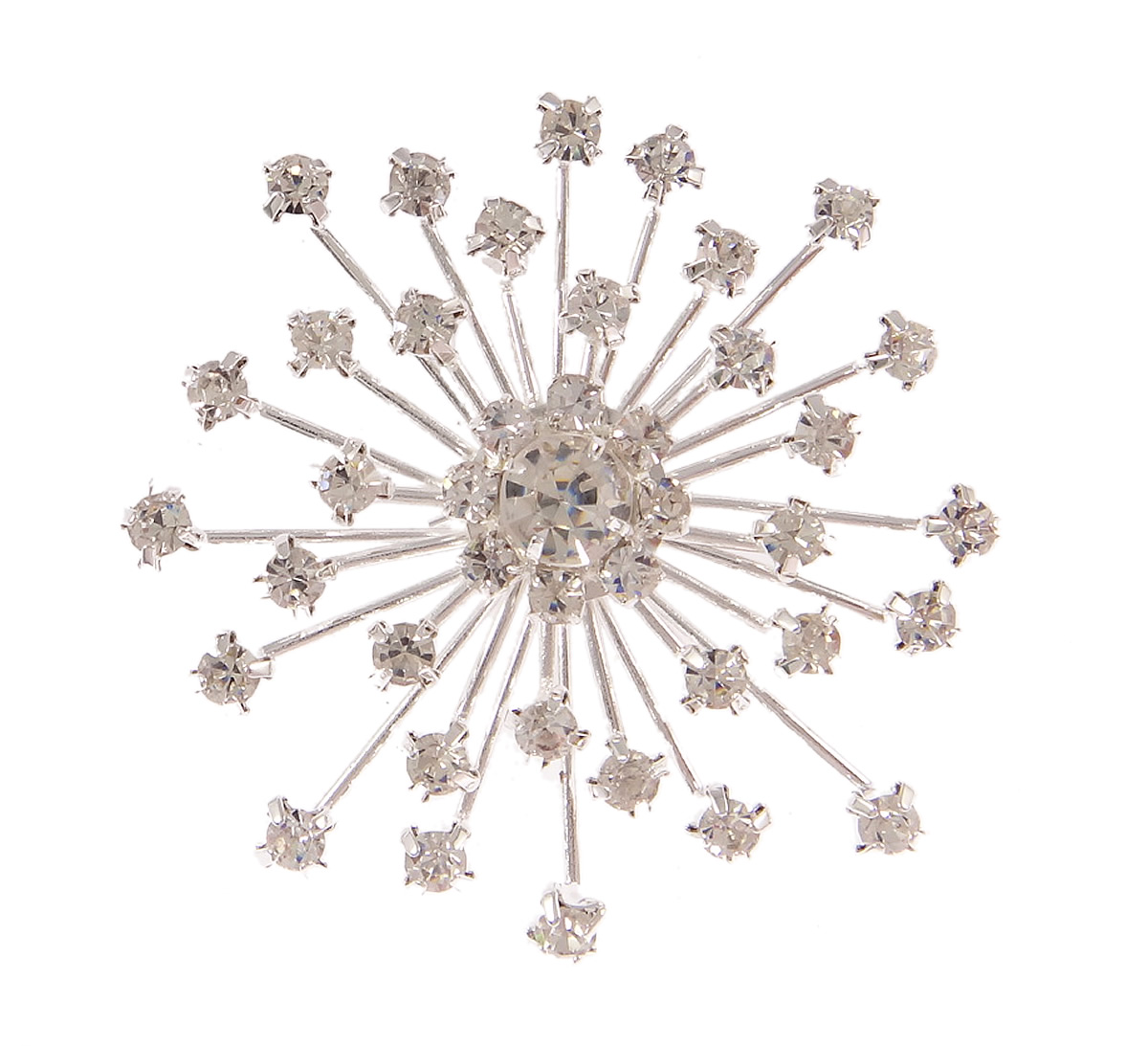 Snowflake brooch made of iron and plated in a bright silver tone with 41 genuine, faceted rhinestone accents. Bright and sparkly. Dimensions: 2 1/4" in diameter.