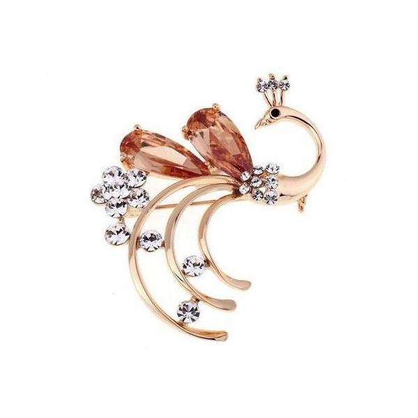 Gold tone, figural brooch of a peacock with faceted clear rhinestones and two large, champagne rhinestone feathers.