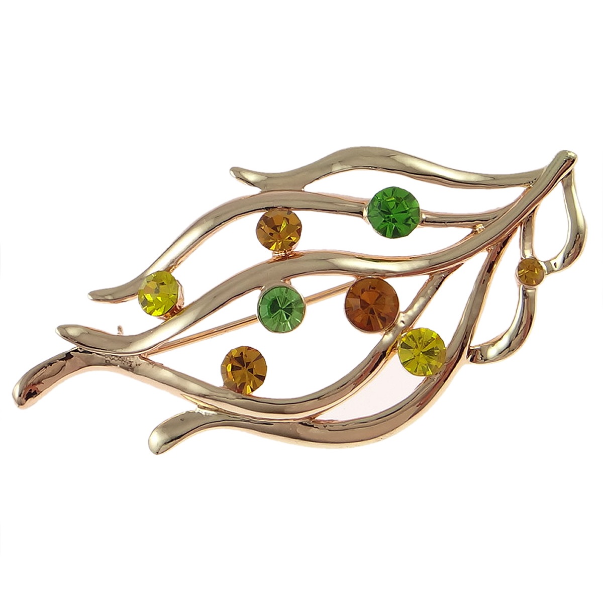 Gold tone leaf with eight faceted rhinestone accents. Great piece for autumn.