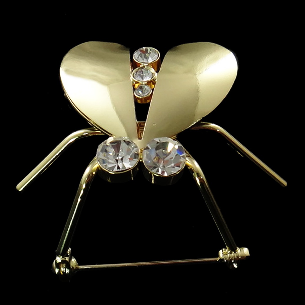 Mirror-finished metal figural brooch in the form of a winged beetle with two large, genuine faceted rhinestone eyes.