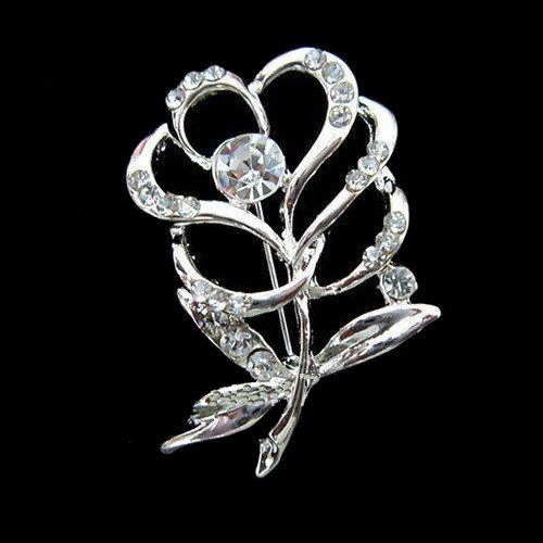 Silver tone brooch depicting a stylized flower blossom and foliage with 25 genuine, faceted rhinestone crystals.