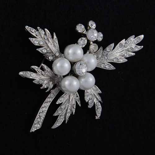 Silver tone brooch depicting flower center blossom of five fuax pearls with 67 genuine clear rhinestone accents on textured foliage.