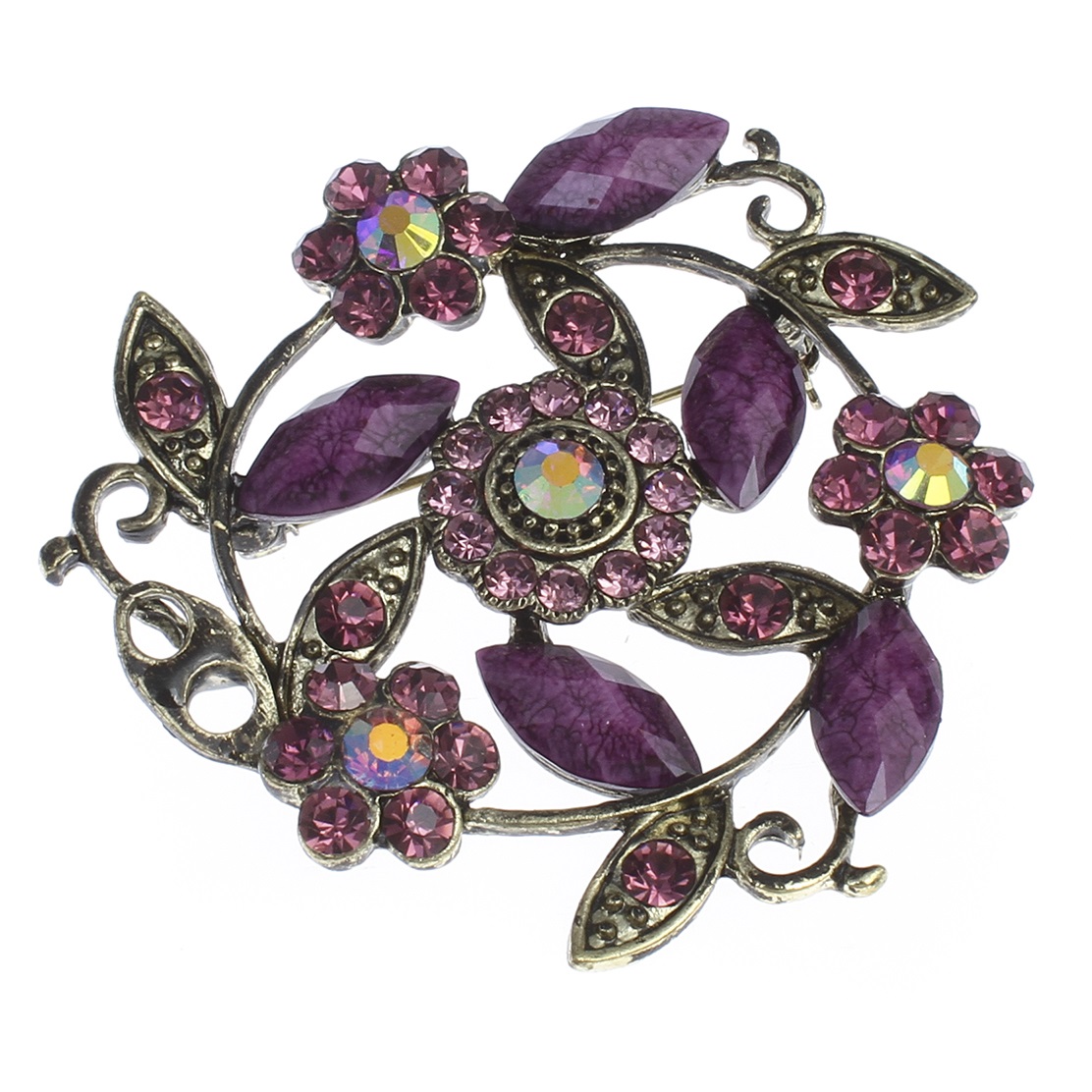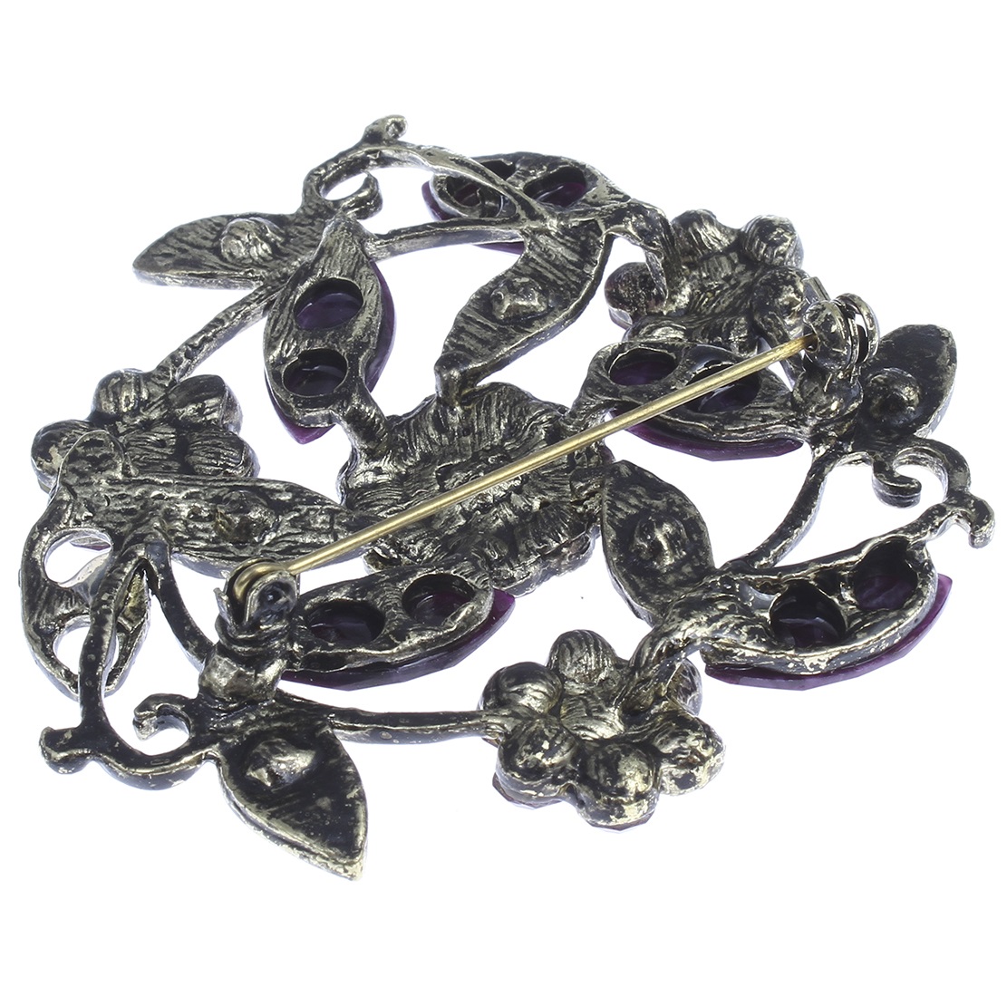 Beautiful, Victorian style brooch featuring scrolling foliage and flowers. Made with forty purple rhinestones and six mottled stone baguettes. Set in bronze tone metal.