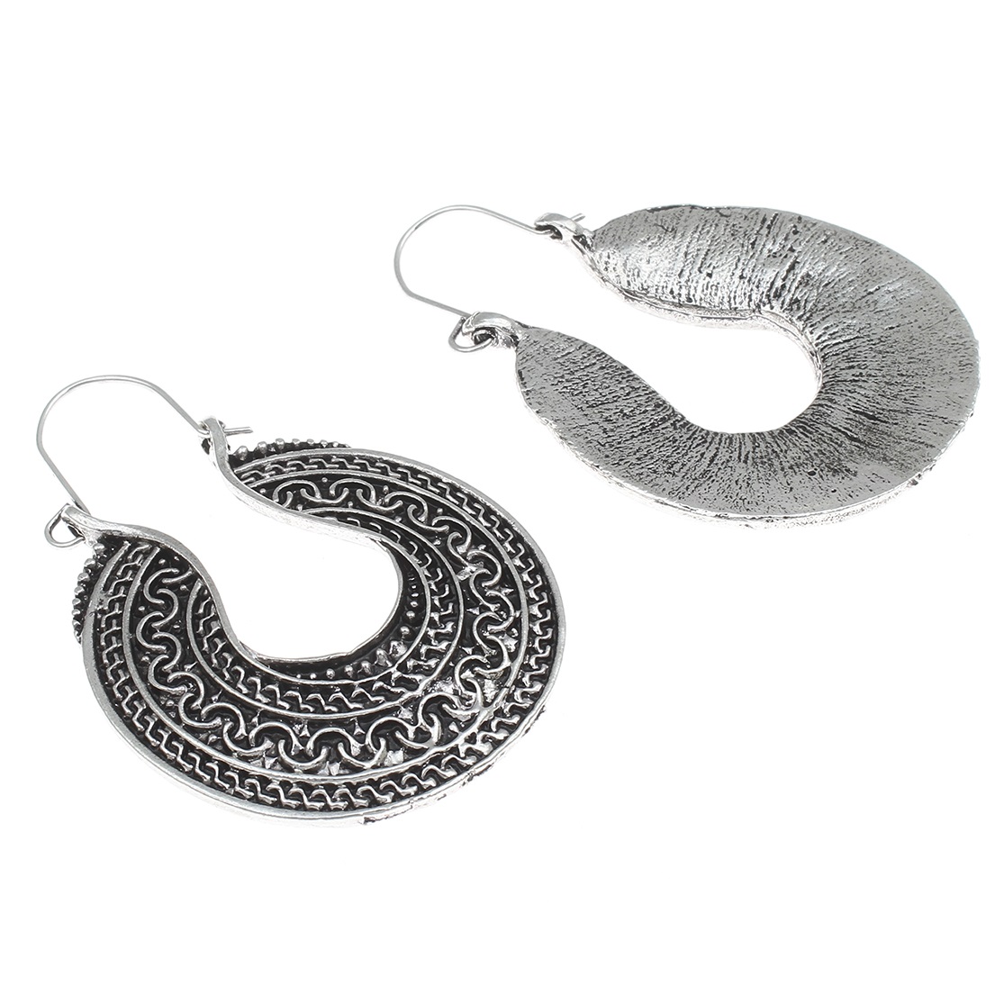 Beautiful, vintage silver tone earrings in a saddlebag form with high-relief beading and filigree scrolls.