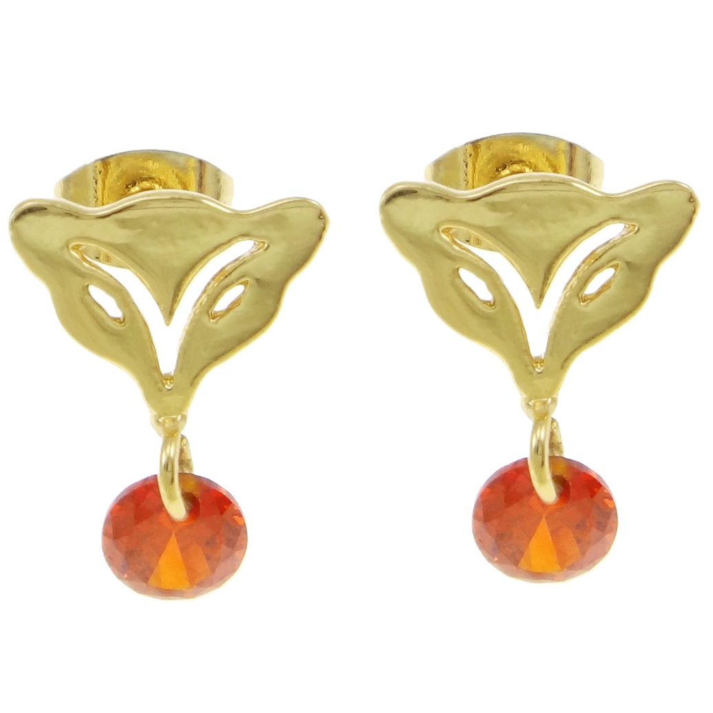 Art Deco dangle earrings in 18K gold overlay featuring a Fox in Art Deco form with red, faceted CZ dangle charm. A bit of 1920's glam and sophistication.