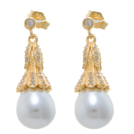 Solid sterling silver earrings with genuine Yellow Gold plate featuring inset faceted CZ accents and a lustrous pearl bead in a tear drop form.