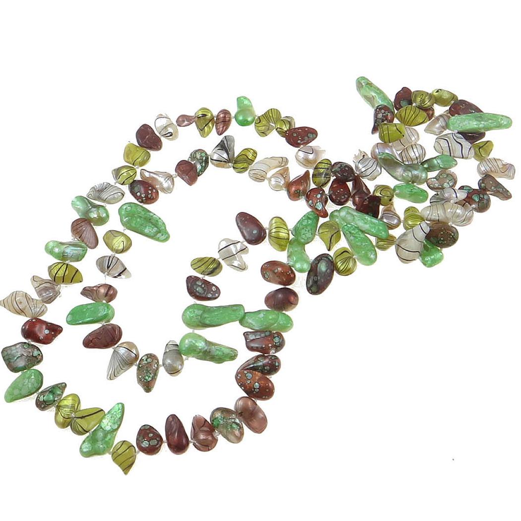 Hand-strung, double-knotted necklace of freshwater Baroque pearls in green, verdigris copper, white and yellow.