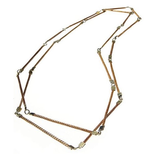 Hand-crafted, designer necklace of multiple links with gold tone findings.
