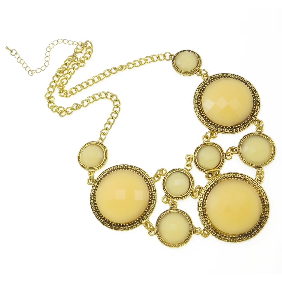 Gold tone necklace in the Art Deco style featuring nine faceted resin cabochons in beaded circular frames.