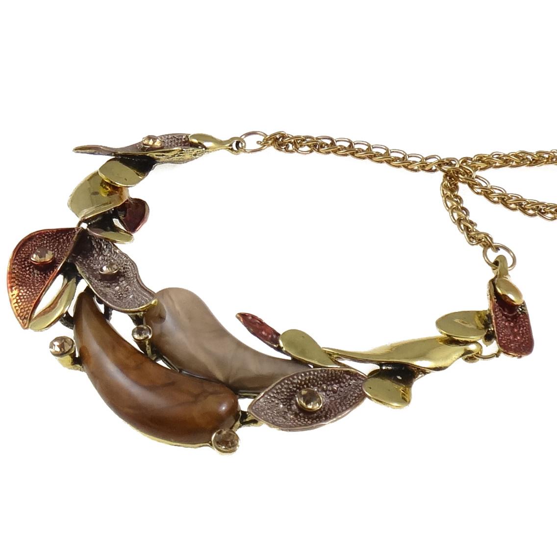 Arts & Crafts style necklace featuring overlays of stylized leaves with enamel decoration and rhinestone accents.