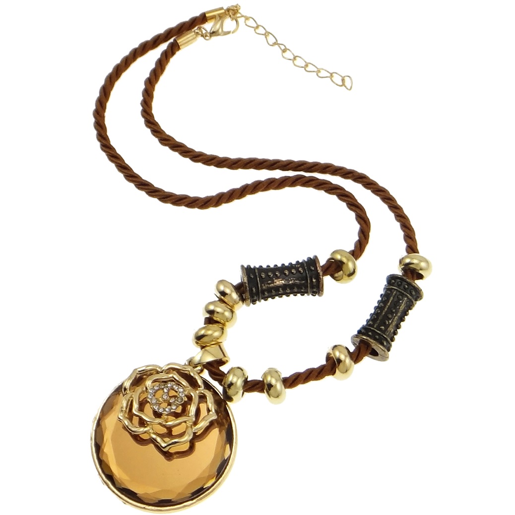 Chic, boho necklace featuring a large, Sienna Brown faceted crystal pendant with Flower Charm overlay accented with White Rhinestones. CCB accent beads.