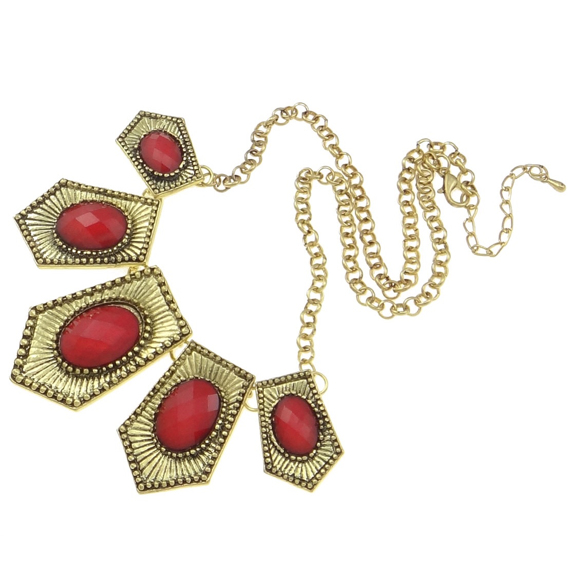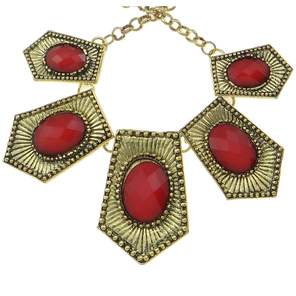 Modern, gold tone necklace featuring faceted, red resin cabochons mounted in metal settings with striations and beading.