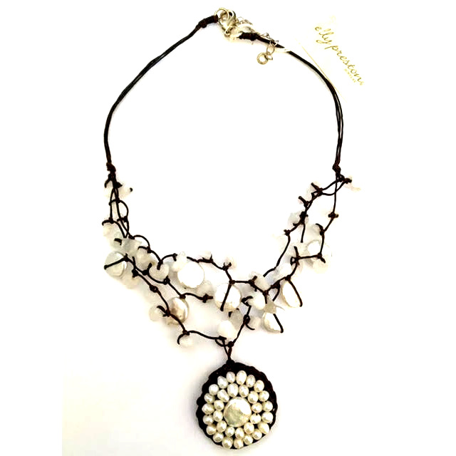 Designer Elly Preston Sidney Necklace featuring large Milk Quartz chips and genuine Freshwater Pearls with a hand-sewn pendant.